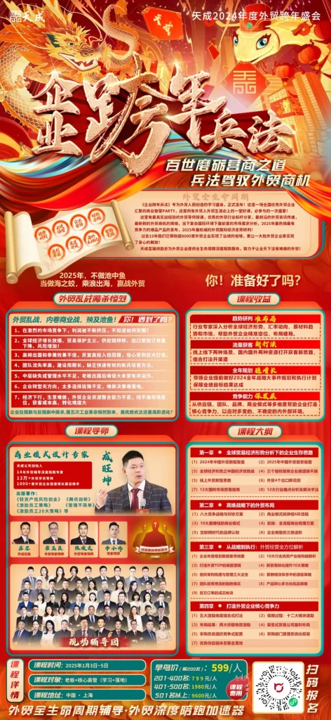 在这个充满挑战与机遇的时代,我们诚挚邀请您参加天成举办的跨年兵法课程。该课程作为外贸人年度必修课,旨在与广大外贸从业者一道,共同探索2025年经济增长的新路径。通过本课程的学习,您将能够掌握最新的外贸策略知识,获取实用的业务工具和天成导师团的深度辅导,为您的外贸事业注入新的活力! 在外贸的战场上,策略是剑,执行是盾,只有剑盾合一,方能克服重重难关,赢得未来。 天成专注于外贸领域 服务中小型外贸企业